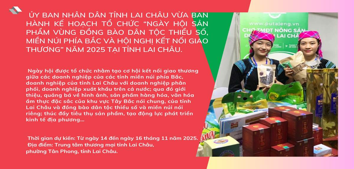 Ủy ban nhân dân tỉnh Lai Châu vừa ban hành Kế hoạch số 6632 /KH-UBND ngày 24/10/2025 tổ chức “Ngày hội sản phẩm vùng đồng bào dân tộc thiểu số, miền núi phía Bắc và Hội nghị kết nối giao thương” năm 2025 tại tỉnh Lai Châu.