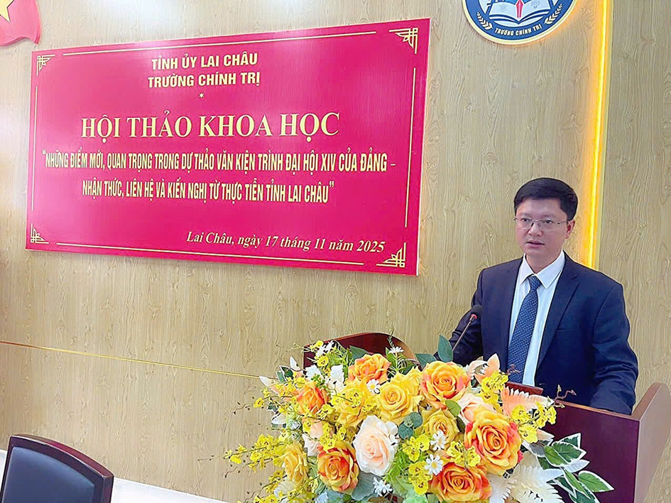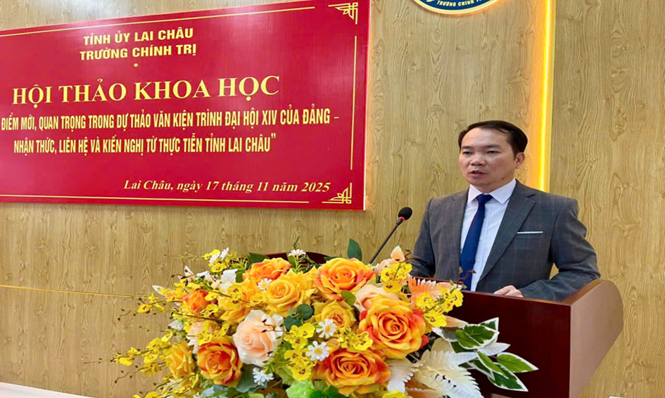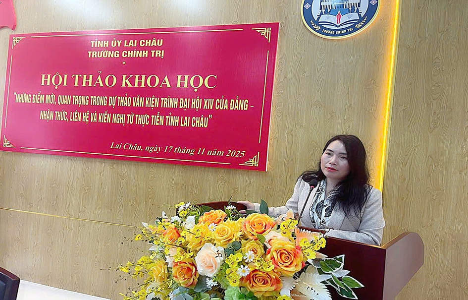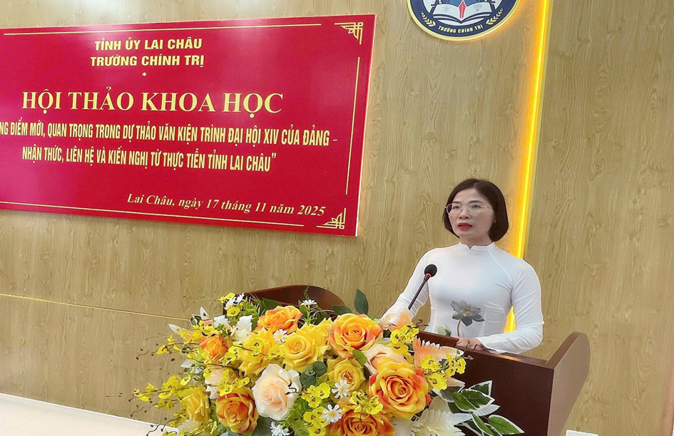 ................Báo cáo đề dẫn Hội thảo, đồng chí Tạ Ngọc Thủy, Phó Hiệu trưởng nhấn mạnh: Hội thảo là hoạt động thiết thực góp phần tuyên truyền, làm sâu sắc nhận thức của cán bộ, giảng viên, học viên về những điểm mới, quan trọng trong Dự thảo Văn kiện trình Đại hội XIV của Đảng; khẳng định vai trò lãnh đạo của Đảng Cộng sản Việt Nam, tư duy chiến lược của Đảng trong bối cảnh mới; đồng thời tạo diễn đàn khoa học để cán bộ, giảng viên, học viên và các nhà khoa học có cơ hội trao đổi, đóng góp ý kiến chất lượng, thiết thực vào Dự thảo Văn kiện trình Đại hội XIV của Đảng.