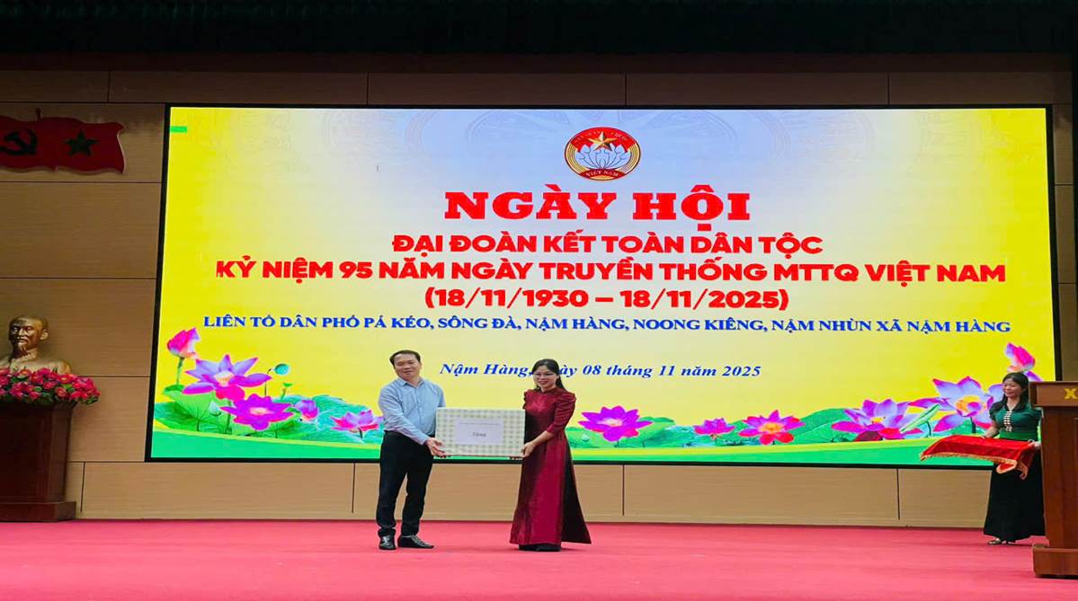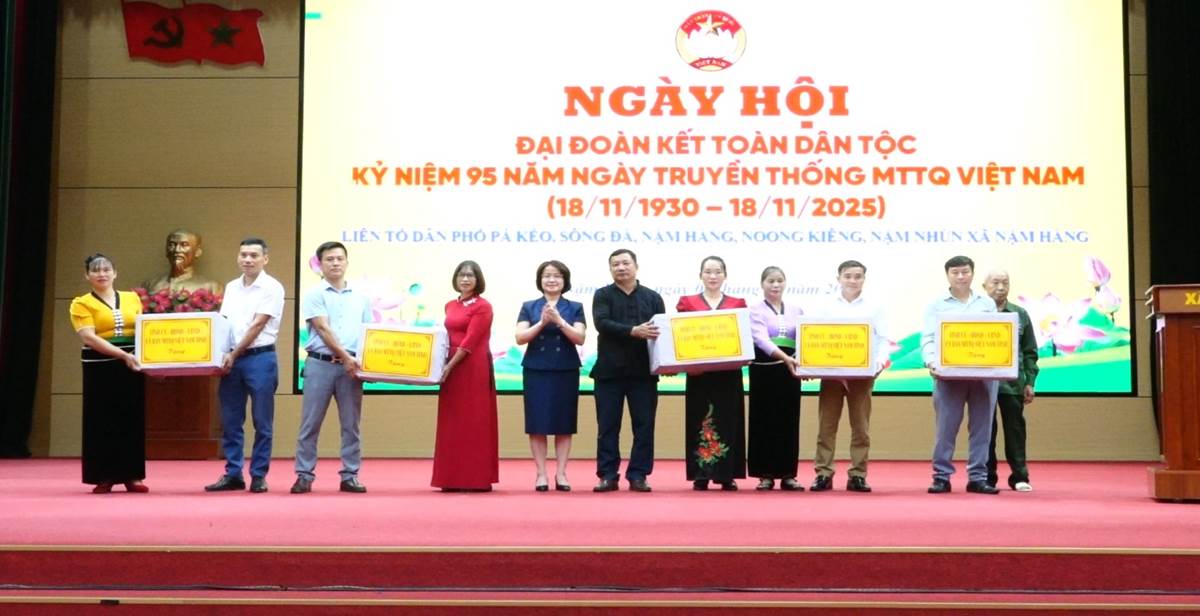 ..................Nhân dịp này, thay mặt Tỉnh ủy, HĐND, UBND, Ủy ban MTTQ Việt Nam tỉnh, đồng chí Lê Thị Hường đã trao quà tặng các tổ dân phố. Đại diện Trường Chính trị tỉnh, đồng chí Lê Chí Công trao quà cho Ủy ban MTTQ Việt Nam xã Nậm Hàng, thể hiện tinh thần gắn bó, đồng hành cùng cơ sở trong công tác xây dựng khối đại đoàn kết toàn dân.